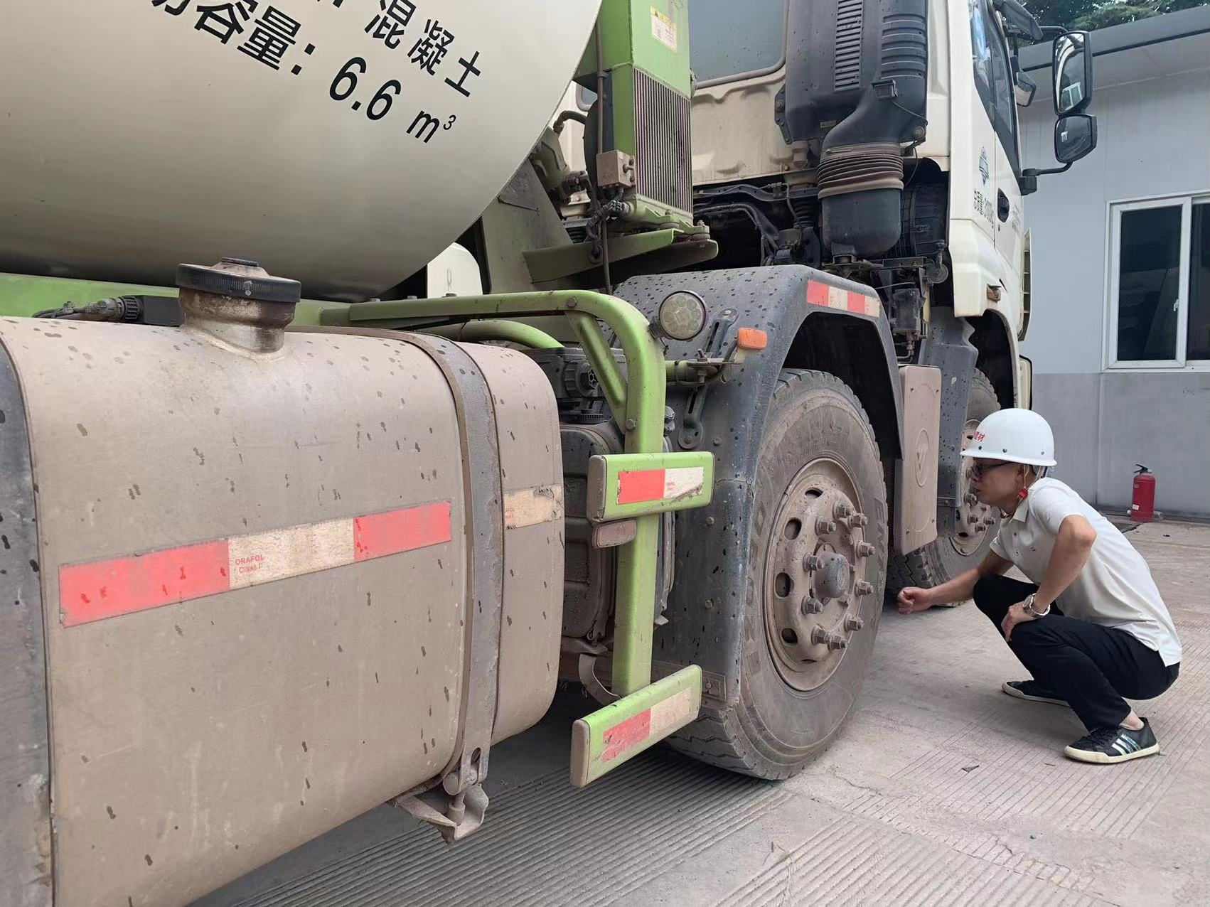 在國(guó)瑞商貿(mào)公司商砼站的停車(chē)場(chǎng)內(nèi), 總有一個(gè)身材清瘦、 架著一副眼鏡的人對(duì)即將開(kāi)展運(yùn)輸任務(wù)的罐車(chē)進(jìn)行安全檢查, 并對(duì)司機(jī)開(kāi)展駕駛前的安全教育, 他從擔(dān)任公司車(chē)隊(duì)長(zhǎng)兼生產(chǎn)調(diào)度以來(lái), 始終堅(jiān)守著車(chē)輛出發(fā)前的檢查工作, 他就是國(guó)瑞黨支部委員王平。