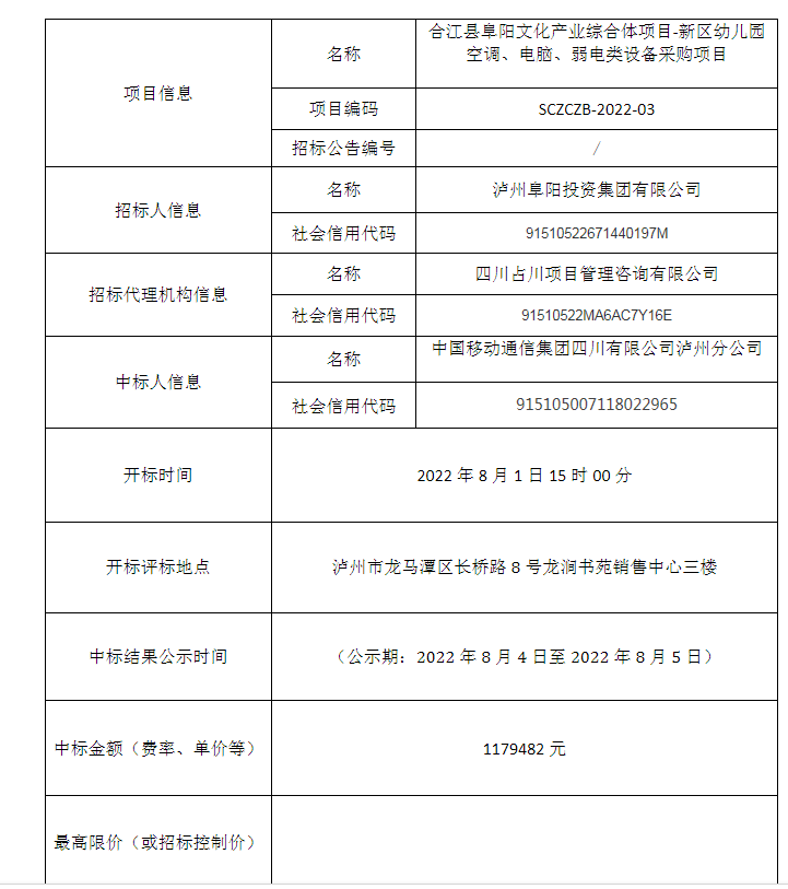 合江縣威廉希爾文化產(chǎn)業(yè)綜合體項目-新區(qū)幼兒園空調(diào)、電腦、弱電類設(shè)備采購項目公開招標(biāo)中標(biāo)結(jié)果公告