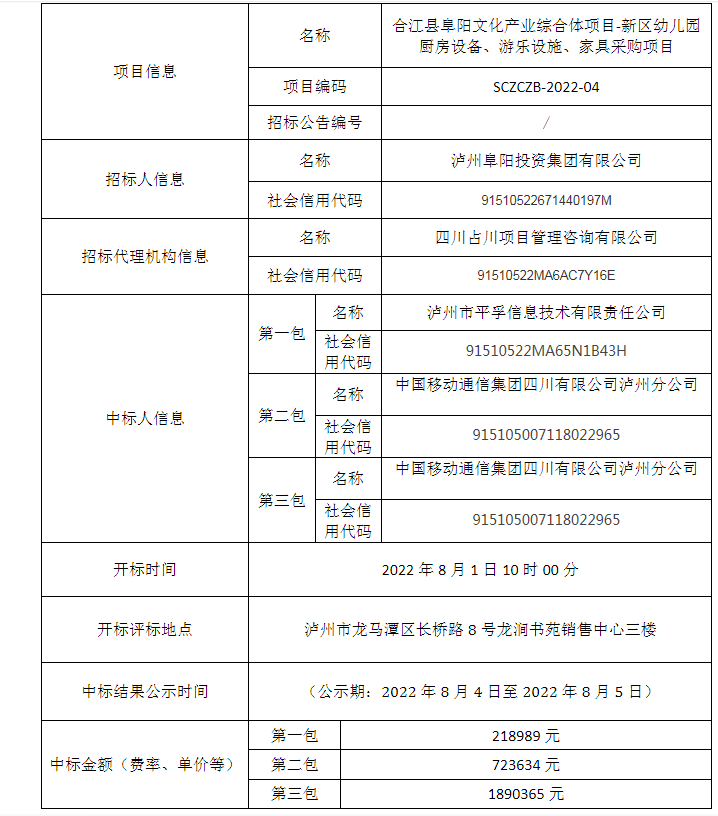 合江縣威廉希爾文化產(chǎn)業(yè)綜合體項(xiàng)目-新區(qū)幼兒園廚房設(shè)備、游樂設(shè)施、家具采購項(xiàng)目公開招標(biāo)中標(biāo)結(jié)果公告