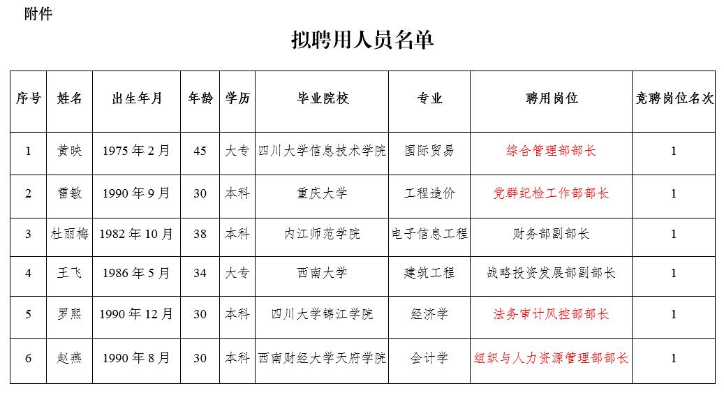 根據(jù)《瀘州williamhill威廉希爾集團(tuán)有限公司關(guān)于2020年本部中層管理崗位內(nèi)部競(jìng)聘的公告》(瀘阜投〔2020〕20號(hào))規(guī)定,經(jīng)威廉希爾集團(tuán)黨委研究決定,擬聘用黃映等6人為瀘州williamhill威廉希爾集團(tuán)有限公司本部中層管理人員?,F(xiàn)面向社會(huì)公示7個(gè)工作日,公示時(shí)間2020年6月2日至2020年6月10日。公示期間,如有問題,請(qǐng)及時(shí)向?yàn)o州williamhill威廉希爾集團(tuán)有限公司組織與人力資源管理部反映。要求舉報(bào)者署實(shí)名,實(shí)事求是地反映問題,并提供必要的調(diào)查線索。