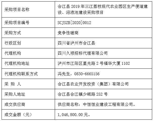 合江縣2019年三江荔枝現(xiàn)代農(nóng)業(yè)園區(qū)生產(chǎn)便道、沼液池建設(shè)采購(gòu)項(xiàng)目競(jìng)爭(zhēng)性磋商成交公告