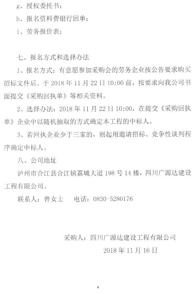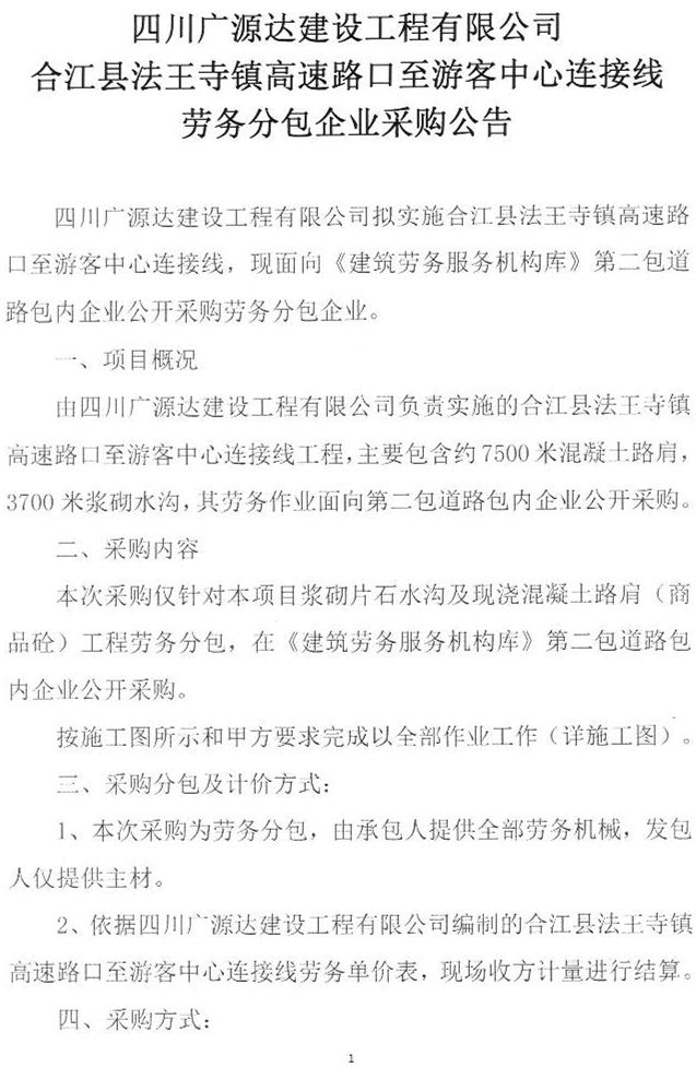 四川廣源達建設工程有限公司合江縣法王寺鎮(zhèn)高速路口至游客中心連接線勞務分包企業(yè)采購公告